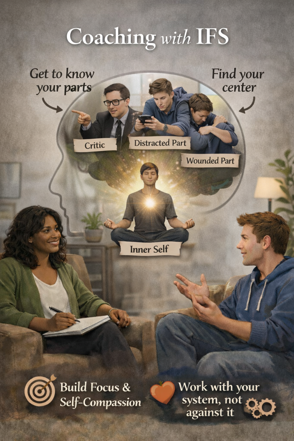 This coaching approach is grounded in the Internal Family Systems (IFS) framework, helping you understand how different parts of you that are protective, driven, avoidant, critical, and creative impact your goals, motivation, and follow-through. Rather than trying to “fix” yourself, coaching supports you in learning how to work with your internal system to create sustainable change.